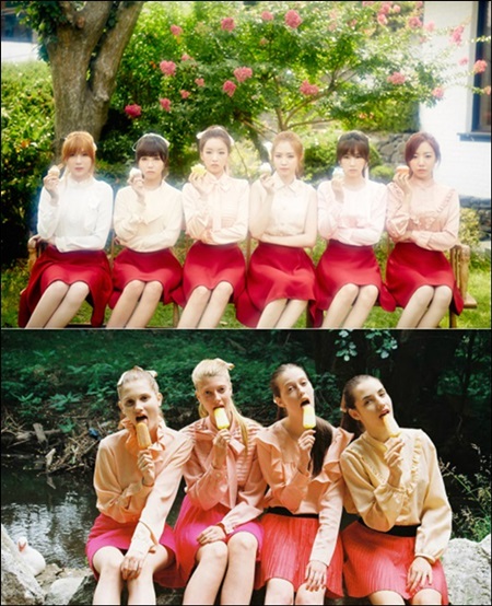 네티즌들이 제시한 사진에는 네 명의 여성이 나란히 앉아 무표정한 얼굴로 아이스크림을 물고 있다. 특히 히들이 입은 블라우스와 에이핑크의 의상은 물론, 배경마저 흡사해 논란이 되고 있다.