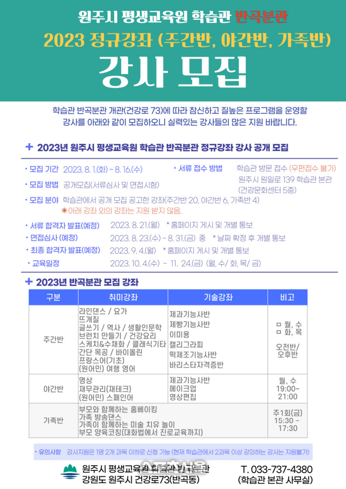 모집 분야 등 자세한 내용은 공고문으로 참고하거나, 학습관 교육운영팀(☎033-737-4380), 원주시콜센터(☎033-742-2111)로 문의하면 된다.