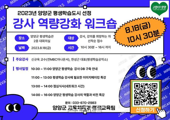워크숍 참가 대상은 양양군 평생학습 프로그램 진행 경험자, 평생교육 강의 관련 자격증 소지자, 양양군 또는 인근 지역에서에서 활동 중이거나 활동 예정인 강사이며, 양양군 평생학습관 홈페이지(https://edu.yangyang.go.kr/)에서 신청할 수 있다.
