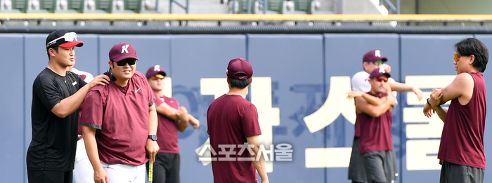 3-1트레이드로 키움에서 LG로 전격 이적한 최원태가 1일 잠실구장에서 열릴 2023 프로야구 키움히어로즈와 LG트윈스의 경기에 앞서 동료들을 만나 인사를 나누고 있다. 노병호 투수코치의 어깨를 주무르는 최원태. 2023.08.01.