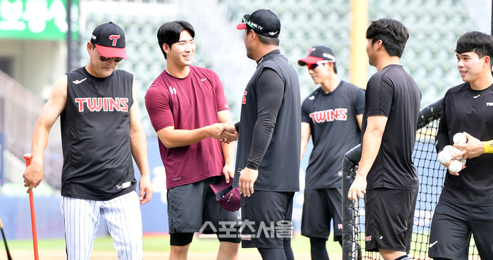 3-1트레이드로 LG에서 키움으로 전격 이적한 이주형이 1일 잠실구장에서 열릴 2023 프로야구 키움히어로즈와 LG트윈스의 경기에 앞서 LG 옛 동료들을 만나 인사를 나누고 있다. 2023.08.01.