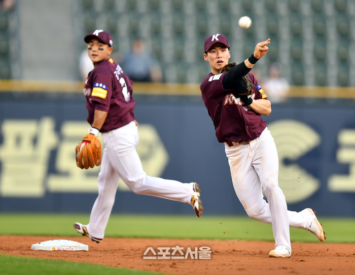 키움 유격수 김혜성이 1일 잠실구장에서 열릴 2023 프로야구 키움히어로즈와 LG트윈스의 경기 2회말 1사 만루 LG 8번타자 박해민의 2루수앞땅볼때 1루주자 박동원을 2루포스아웃시킨후 1루로 송구해 이닝을 끝내고 있다. 2023.08.01.