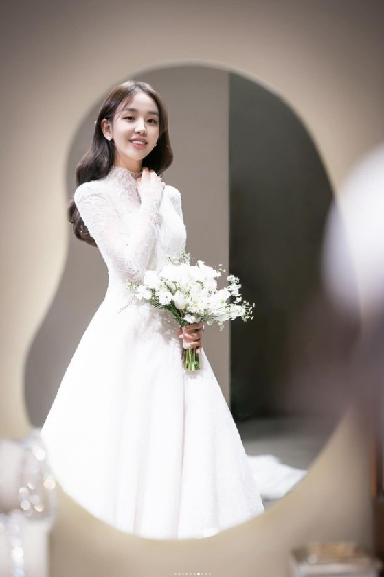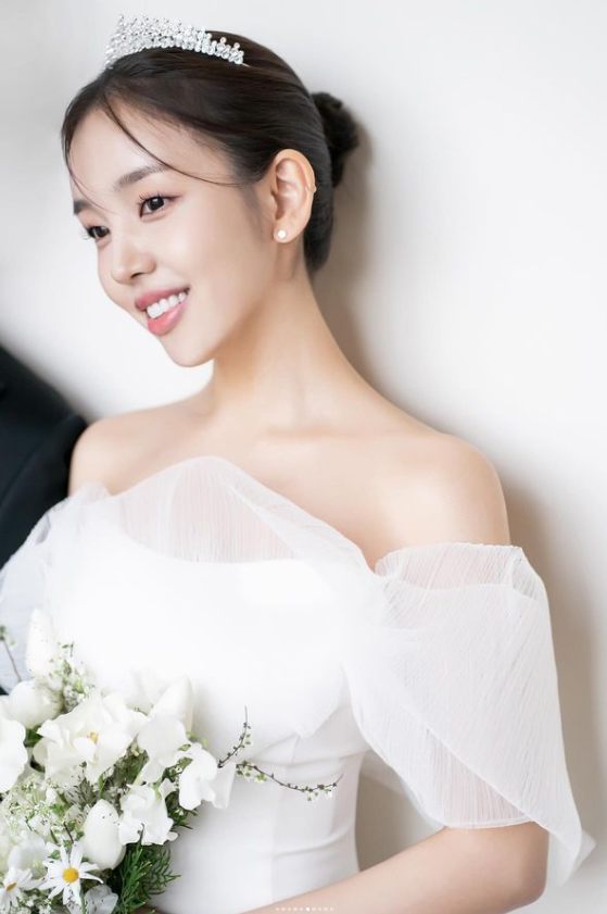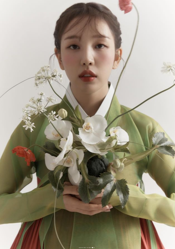 단아한 한복 사진도 공개됐다. 연녹색 저고리에 붉은 색 치마를 입고 꽃문양 뒤꽂이로 새색시의 분위기를 풍겼다.