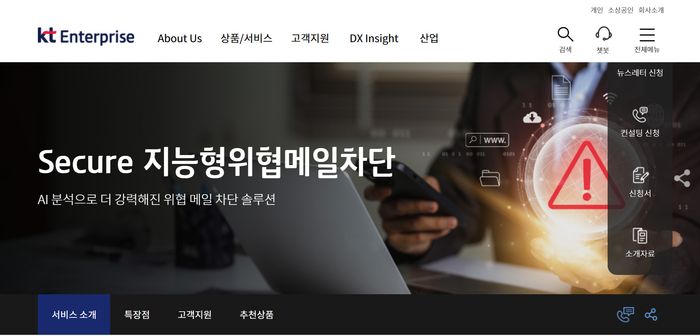 ‘KT 시큐어 지능형 위협 메일 차단’ 서비스는 도메인네임시스템(DNS) 설정을 변경하는 구독형 서비스로 제공돼, 고가의 구축형 보안 시스템보다 비용과 관리 부담을 줄일 수 있다.