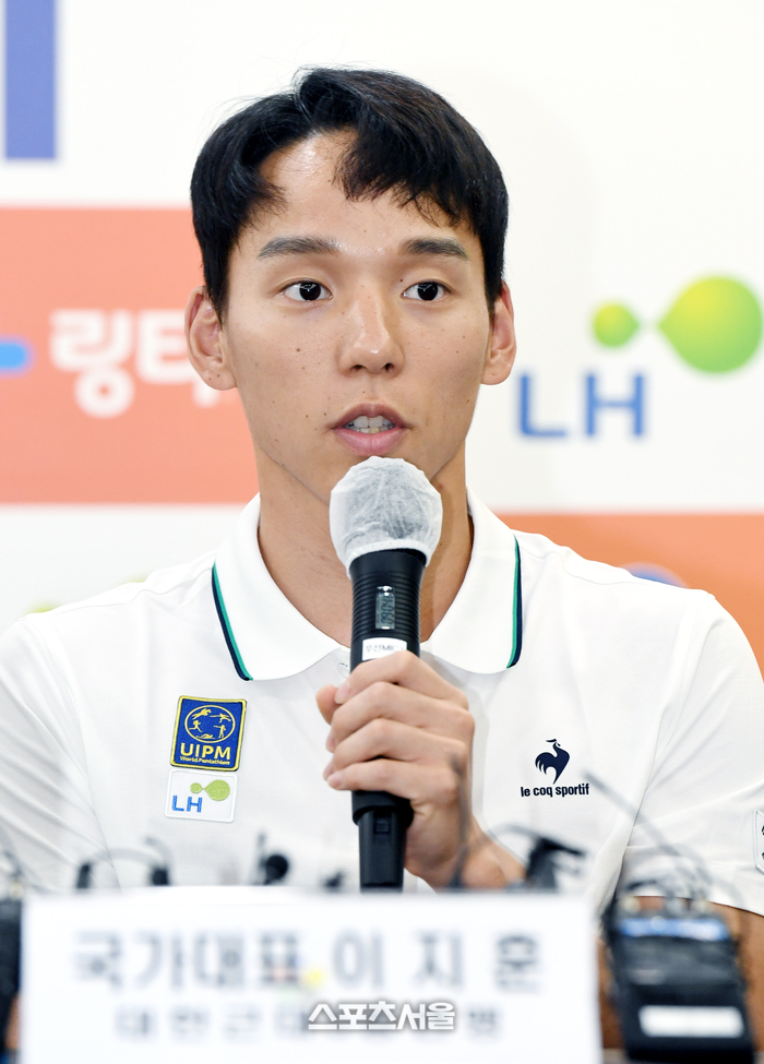 근대5종 국가대표팀의 이지훈이 2일 서울 송파구 올림픽파크텔에서 진행된 항저우 아시안게임 근대5종 국가대표 미디어데이 행사에서 취재진의 질문에 답을 하고 있다. 2023. 8. 2. 박진업기자 upandup@sportsseoul.com