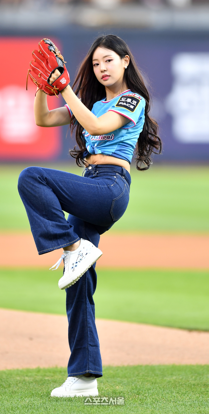 2022년 미스코리아 선 유시은이 2일 수원KT위즈파크에서 열린 2023 프로야구 KT위즈와 SSG랜더스의 경기에서 시구를 하며 경기시작을 알리고 있다. 2023.08.02.