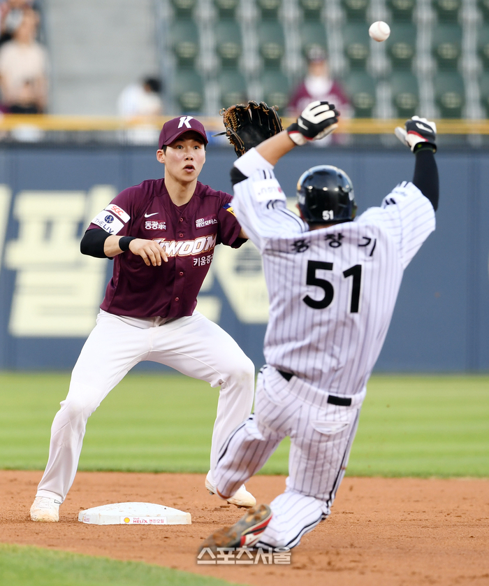 키움 히어로즈 유격수 김혜성(왼쪽)이 2일 잠실구장에서 열린 2023 KBO리그 LG 트윈스와 경기 3회말 1사 1루 LG 문성주의 1루 땅볼 때 1루수 이원석의 송구를 받고 있다. 2023. 8. 2. 잠실 | 박진업기자 upandup@sportsseoul.com
