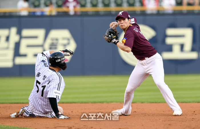 키움 히어로즈 유격수 김혜성(오른쪽)이 2일 잠실구장에서 열린 2023 KBO리그 LG 트윈스와 경기 3회말 1사 1루 LG 문성주의 1루 땅볼 때 1루 주자 홍창기를 포스 아웃한 뒤 1루로 송구하고 있다. 2023. 8. 2. 잠실 | 박진업기자 upandup@sportsseoul.com