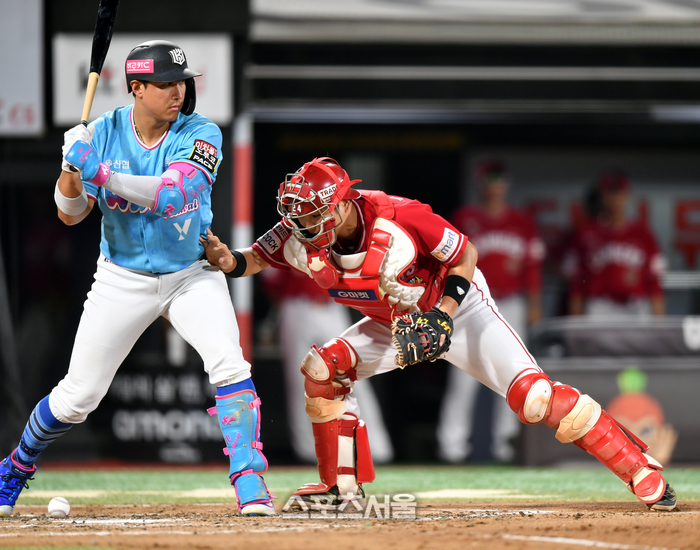 SSG 포수 김민식이 2일 수원KT위즈파크에서 열린 2023 프로야구 KT위즈와 SSG랜더스의 경기 6회말 2사 1루 김광현의 볼을 포구하지 못하며 1루주자 문상철의 2루행을 허용하고 있다.. 2023.08.02.