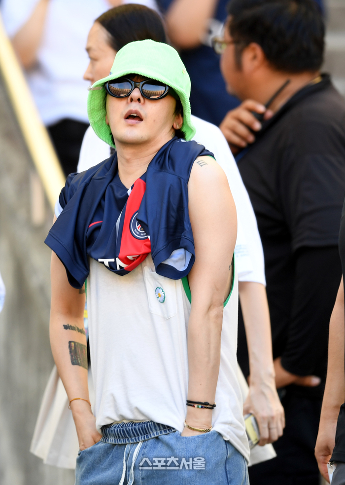GD가 3일 부산아시아드주경기장에서 열린 PSG와 전북 현대와 쿠팡플레이 시리즈 프리시즌 친선경기플 찾았다. 지드래곤은 파리생제르맹(PSG)와 본인의 브랜드 피스마이너스원이 공동작업을 했다는 사실을 알리며 유니폼 사진을 공개했다. 2023. 8. 3. 부산 | 최승섭기자 thunder@sportsseoul.com