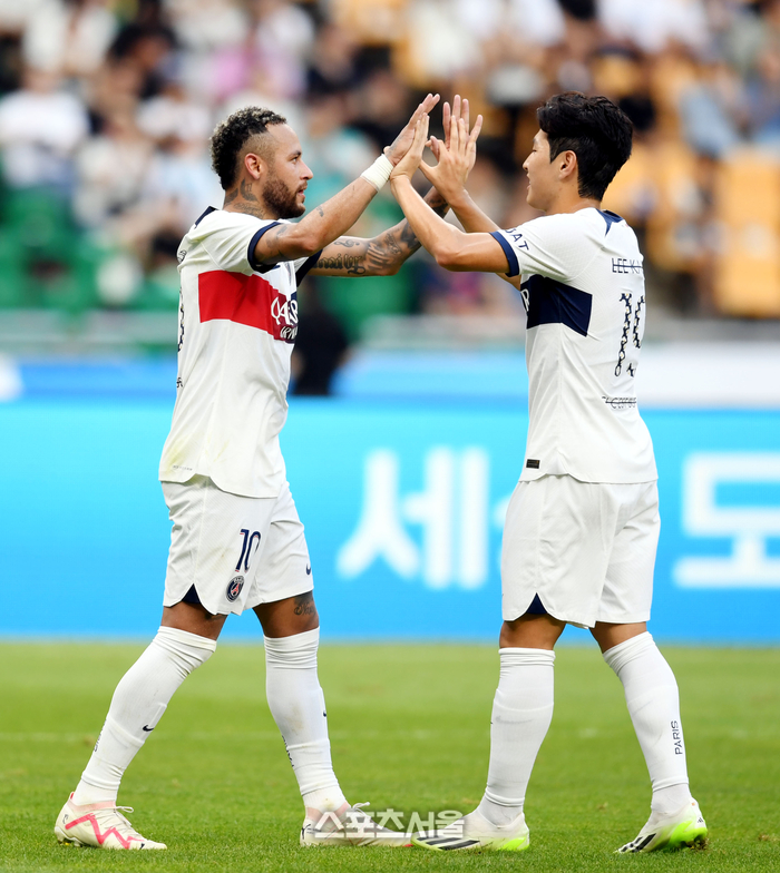 파리생제르맹(PSG) 네이마르가 3일 부산아시아드주경기장에서 열린 전북 현대와 쿠팡플레이 시리즈 프리시즌 친선경기에서 두 번째 골을 넣은 후 이강인과 하이파이브를 하고 있다. 2023. 8. 3. 부산 | 최승섭기자 thunder@sportsseoul.com