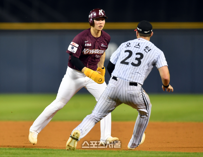 키움 2번타자 김혜성이 3일 잠실구장에서 열린 2023 프로야구 LG트윈스와 키움히어로즈의 경기 7회초 1사 후 출루했지만 도슨 타석때 이유찬 견제구에 걸려 태그아웃되고 있다. 2023.08.03.