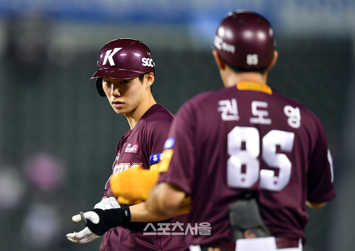 키움 2번타자 김혜성이 3일 잠실구장에서 열린 2023 프로야구 LG트윈스와 키움히어로즈의 경기 9호초 2사 1,루에서 안타로 출루하고 있다. 2023.08.03.