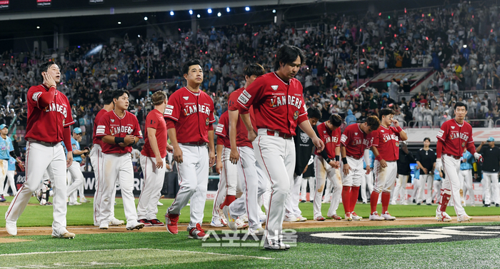 SSG 랜더스 선수들이 3일 수원 KT위즈파크에서 열린 2023 KBO리그 KT 위즈와 경기에서 패한 뒤 팬들에게 인사를 하고 덕아웃으로 들어가고 있다. SSG는 3연패에 빠졌다. 2023. 8. 3. 수원 | 박진업기자 upandup@spotsseoul.com