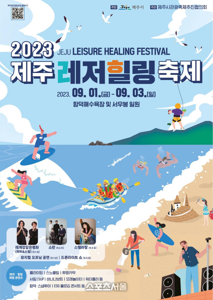 [스포츠서울ㅣ제주=김기원 기자] 레저스포츠 체험과 문화예술을 융합해 다양한 즐거움을 선사할 ‘2023 제주레저힐링축제’가 9월 1일(금) ∼ 9월 3일(일) 3일간 함덕해수욕장 일원에서 열린다.