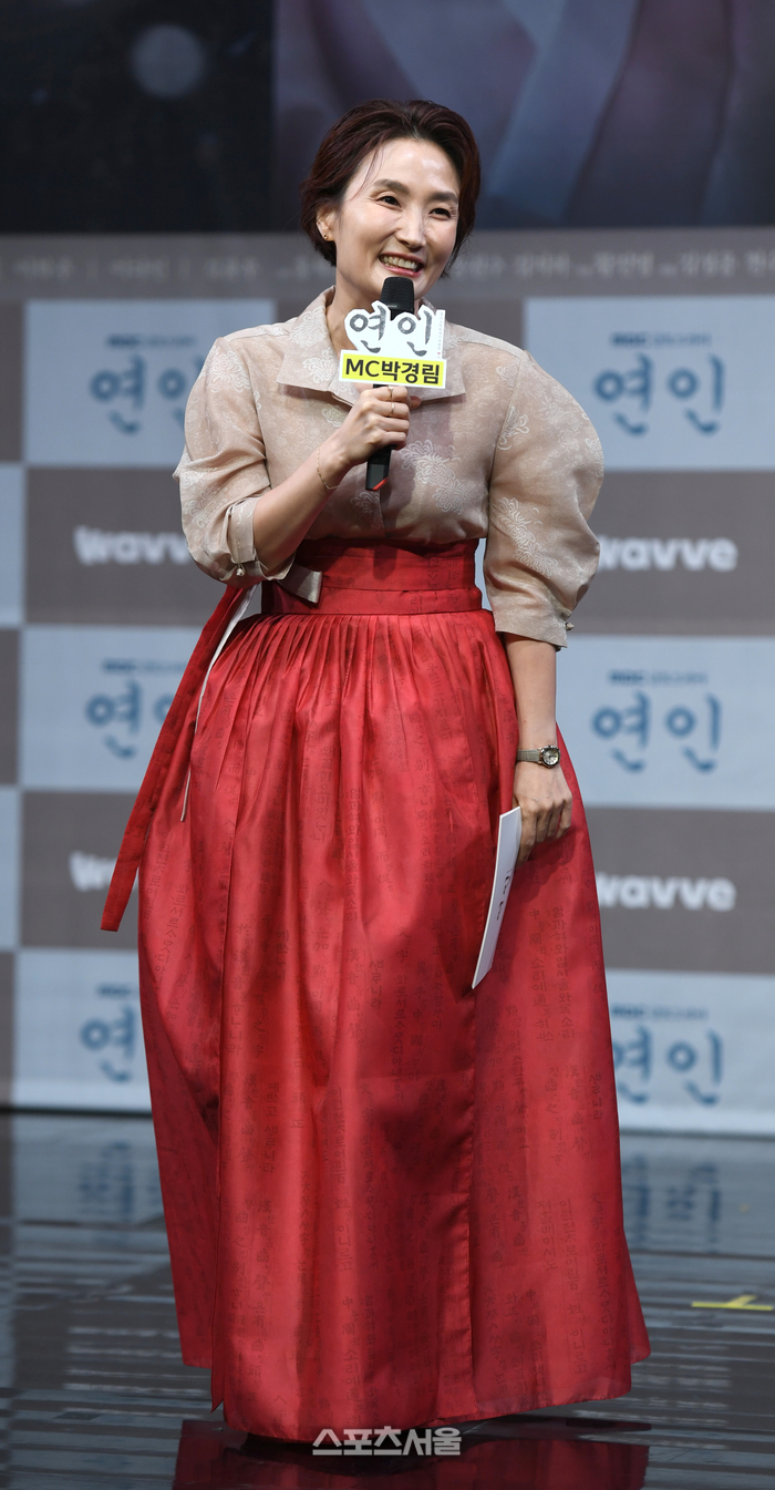 박경림이 4일 서울 상암동 MBC에서 열린 드라마 ‘연인’ 제작발표회 사회를 보고 있다. ‘연인’은 병자호란을 겪으며 엇갈리는 연인들의 사랑과 백성들의 생명력을 다룬 휴먼역사멜로드라마로 4일 오후 9시 50분 첫 방송된다. 2023. 8. 4. 최승섭기자 thunder@sportsseoul.com