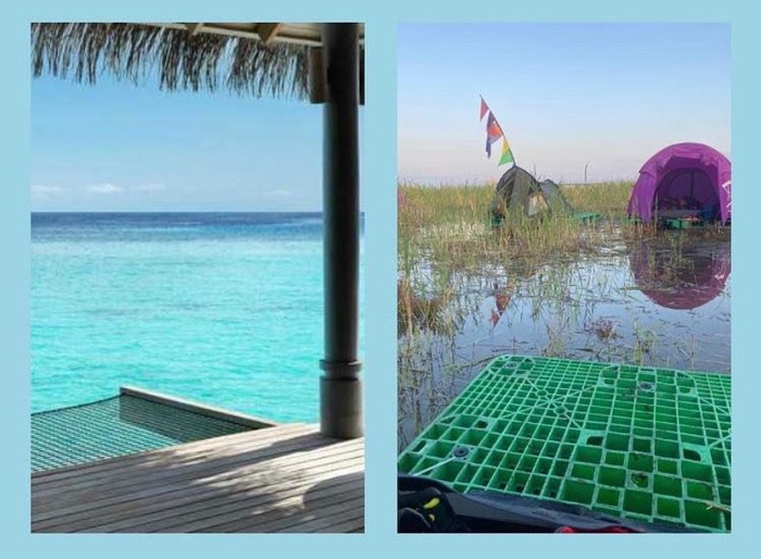 먼저 장맛비에 침수된 새만금 잼버리 야영장 모습과 관련한 밈이다. 왼쪽 사진은 유명 휴양지의 아름다운 풍경인 반면, 오른쪽 사진은 물에 잠겨 잼버리 텐트와 팔레트가 둥둥 떠다니는 모습이다. 휴양지와 새만금 잼버리를 극단적으로 비교함으로써 참담함을 표현했다.