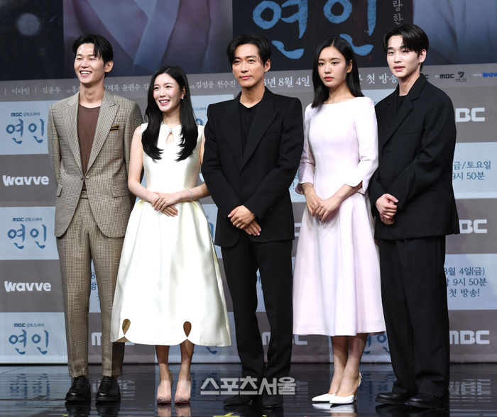 이학주, 이다인, 남궁민, 안은진, 김윤우(왼쪽부터)가 4일 서울 상암동 MBC에서 열린 드라마 ‘연인’ 제작발표회에서 포토타임을 갖고 있다. ‘연인’은 병자호란을 겪으며 엇갈리는 연인들의 사랑과 백성들의 생명력을 다룬 휴먼역사멜로드라마로 4일 오후 9시 50분 첫 방송된다. 2023. 8. 4. 최승섭기자 thunder@sportsseoul.com