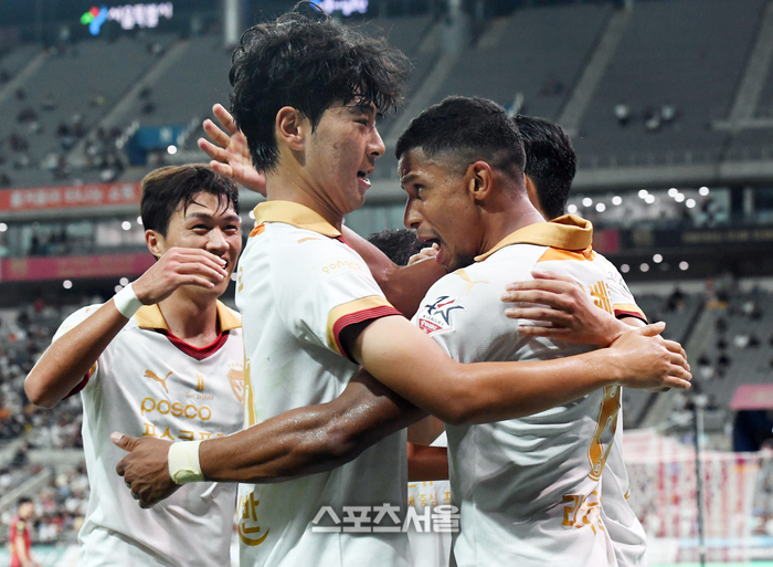 포항 스틸리스 오베르단(오른쪽)이 4일 서울월드컵경기장에서 열린 하나원큐 K리그1 FC서울과 경기에서 동점골을 넣은 뒤 김준호와 함께 기뻐하고 있다. 2023. 8. 4. 박진업기자 upandup@sportsseoul.com