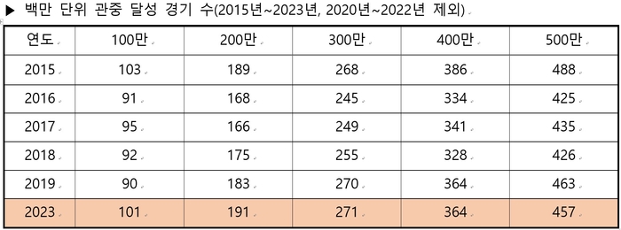 이날까지 504만2283명이 구장을 찾아 457경기 만에 누적관중 500만명을 돌파했다. 코로나 이전인 2019년에는 463경기 만에 500만 관중을 돌파했으니, 동일 경기 수 대비 3.4%포인트 증가한 셈이다. 경기당 평균 관중은 1만1033명이다.