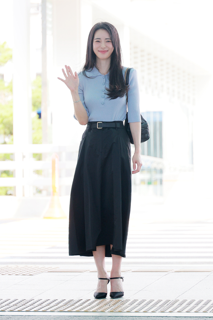 이날 임지연은 은은한 푸른빛의 카라 니트와 벨트 디테일이 돋보이는 롱 스커트로 여름 데일리룩을 완성시켰다.
