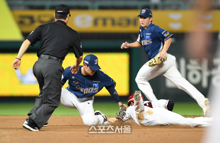 SSG 랜더스 최지훈(오른쪽)이 8일 인천 SSG랜더스필드에서 열린 2023 KBO리그 NC 다이노스와 경기 6호말 2사 1루 상황에서 2루 도루를 시도하다 NC 유격수 김주원에 태그아웃되고 있다. 2023. 8. 8. 문학 | 박진업기자 upandup@sportsseoul.com