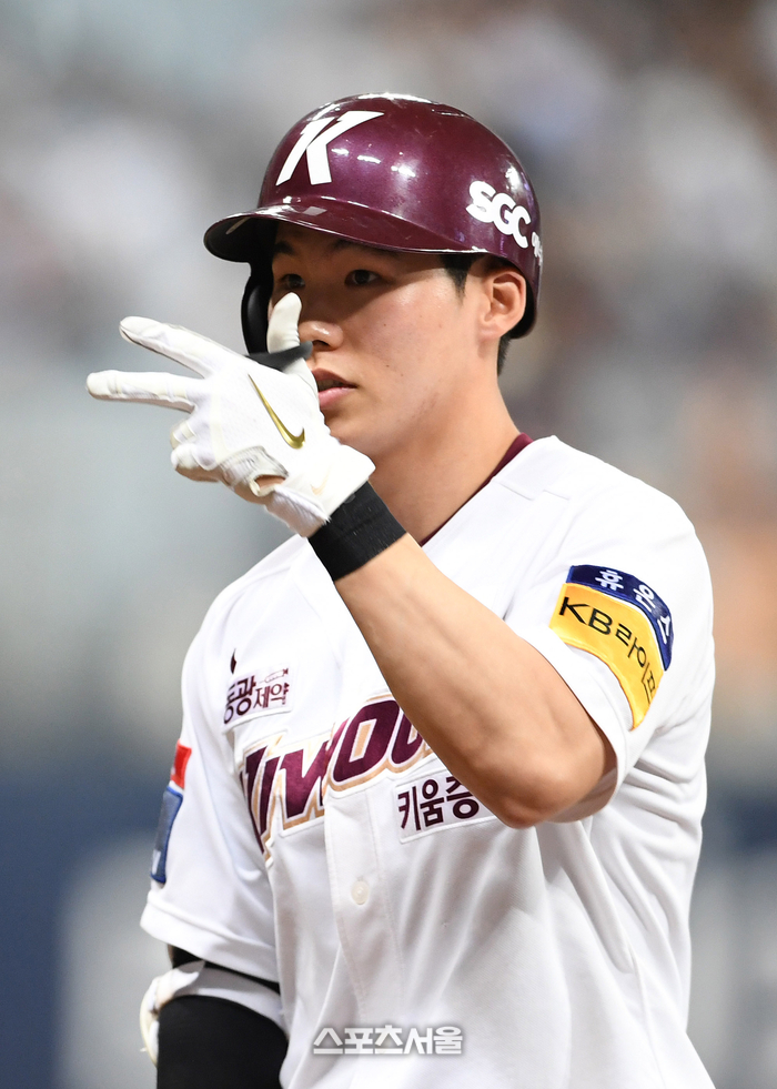 키움 히어로즈 김혜성이 9일 고척스카이돔에서 열린 2023 KBO리그 롯데 자이언츠와 경기 3회말 무사 2루 상황에서 롯데 선발 박세웅을 상대로 1타점 역전 적시타를 치고 세리머니를 하고 있다. 2023. 8. 9. 고척 | 박진업기자 upandup@sportsseoul.com