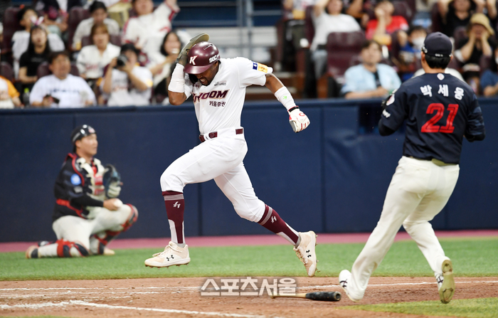 키움 히어로즈 도슨이 9일 고척스카이돔에서 열린 2023 KBO리그 롯데 자이언츠와 경기 3회말 1사 만루 상황 이주형의 1루 땅볼 때 상대 송구 실책을 틈타 2루에서 홈까지 뛰어 득점을 하면서 송구에 맞지 않기 위해 손으로 얼굴을 가리고 있다. 2023. 8. 9. 고척 | 박진업기자 upandup@sportsseoul.com