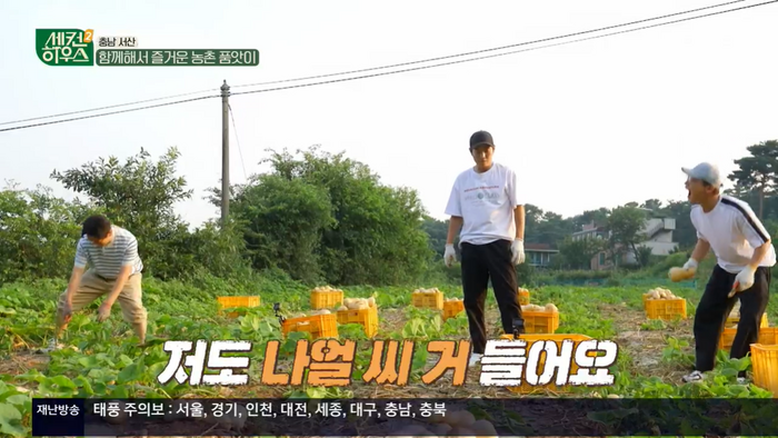 한바탕 일을 마친 후 새참 시간이 찾아왔다. 새참 메뉴는 땅콩호박과 채주스였다. 조재윤은 “이거 호박엿 맛이 난다”라고 전했다. 수확을 마친 이들은 트럭에 한가득 상자를 실으며 고된 일을 마무리했다.