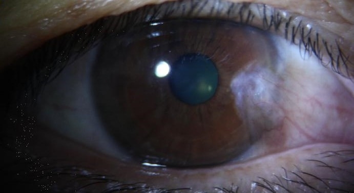 초기에는 증상이 없다가 크기가 커지면 이물감, 통증, 충혈, 눈이 시린 증상이 나타날 수 있다. 크기가 너무 커질 경우 수술이 필요하다. 단 만 60세 이전에 수술받으면 재발률이 40~50%로 높은 편이다. 따라서 각막 침범 정도에 따라 수술 시기를 결정해야 한다.