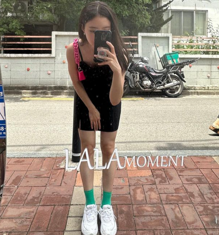 사진 속 이세영은 타이트한 민소매 미니 원피스를 입고 캐주얼한 운동화를 매치해 독특한 코디를 선보였다.