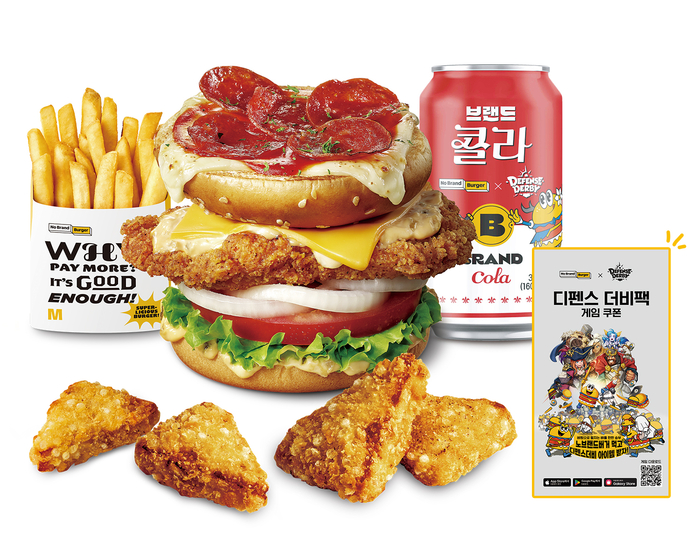 노브랜드 버거 ‘디펜스 더비팩’은 지난달 출시 이후 인기를 끌고 있는 이색 메뉴 ‘페퍼로니피자 치킨’을 비롯해 ‘감자튀김’, ‘크런치 오징어(4조각)’, 음료 등으로 구성됐다. 또 ‘디펜스 더비팩’에는 노브랜드 버거 테마의 캐슬 스킨, 희귀 카드 1종 및 골드와 엘릭서 세트, 보석 200개 및 골드와 엘릭서 세트 등 다양한 아이템 중 하나를 획득할 수 있는 게임 쿠폰도 포함되어있다.