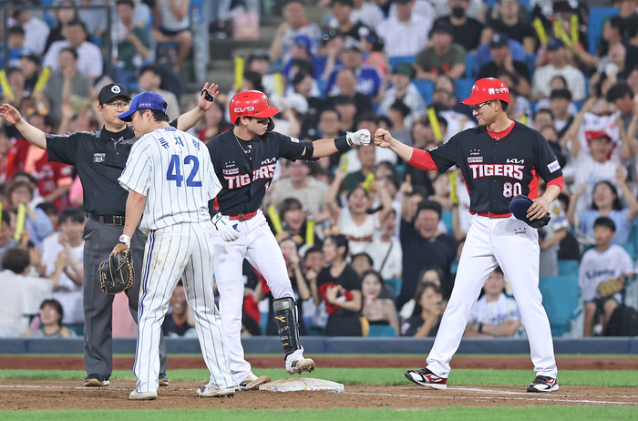 대타 이우성이 좌월 투런 홈런을 폭발시켜 단숨에 4-5가 됐다. 김도영이 중월 3루타를 쳤고, 박찬호가 중전 적시타를 때려 5-5 동점까지 일궜다.
