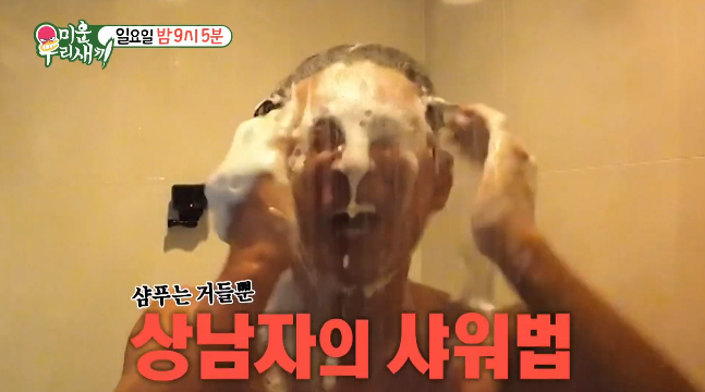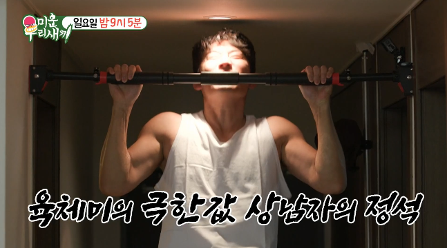 잔뜩 성난 근육으로 아침부터 턱걸이를 하는 고준은 파이팅 넘치는 샤워법으로도 엄마들을 웃게 했다.