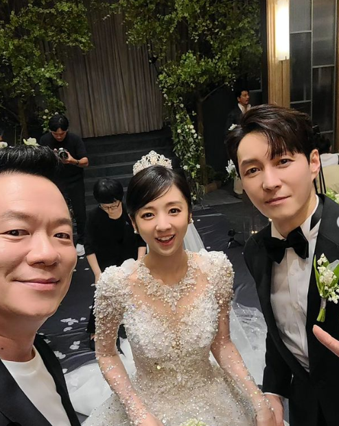 덧붙인 사진에는 지난 20일 열린 심형탁과 그의 18세 연하 일본인 히라이 사야의 한국 결혼식 사진이 담겼다. 김태균은 웨딩드레스와 턱시도를 입은 부부와 함께 사진을 남겼다.