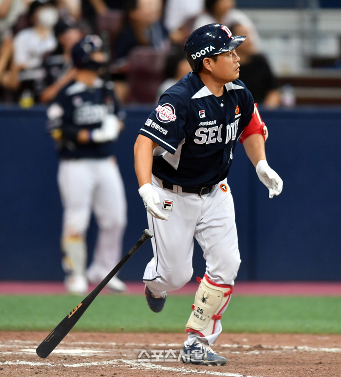 두산 양의지가 22일 고척스카이돔에서 열린 2023 프로야구 키움히어로즈와 두산베어스의 경기 8회초 1사에서 대타로 나와 복귀 첫 타석 홈런을 신고하고 있다. .2023.08.22.