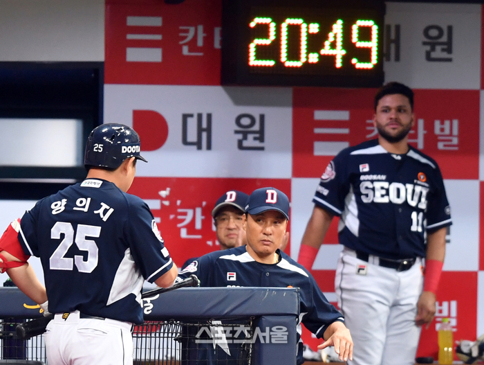 이 감독은 5-0으로 앞선 8회초 1사 후 양의지 카드를 꺼내들었다. 3회 3득점 후 소강상태이기도 했고, 라울 알칸타라가 강판한 뒤여서 추가점이 필요한 때이기도 했다. 물론 양의지에게 실전점검 기회를 주려는 목적도 담긴 기용이다.