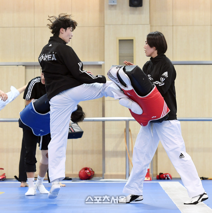 태권도 국가대표 이다빈(왼쪽)이 24일 충북 진천 국가대표선수촌에서 진행된 2022 항저우아시아경기대회 D-30 미디어데이 행사에서 공개 훈련을 하고 있다. 2023. 8. 24. 진천 | 박진업기자 upandup@sportsseoul.com