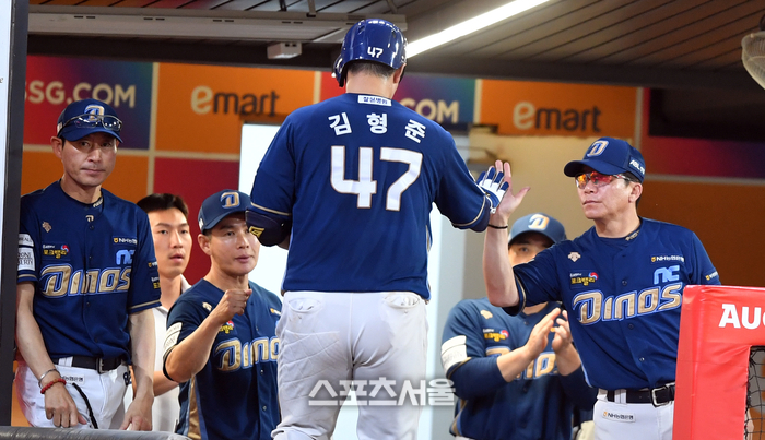 NC 9번타자 김형준이 24일 인천SSG랜더스필드에서 열린 2023 프로야구 SSG랜더스와 NC다이노스의 경기 5회초 1사 후 맥카티를 상대로 좌중월 1점홈런을 터트린 후 홈인하고 있다.2023.08.24.