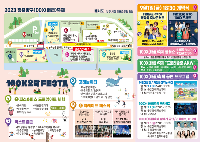 2일 오후 2시에는 가족 뮤지컬 ‘가방 들어주는 아이’ 공연을 진행해 어린이와 가족 단위 방문객들이 즐길 수 있도록 했고, 오후 5시부터는 국악밴드 ‘더 튠’의 국악공연이 펼쳐진다. 저녁 7시에는 육중완 밴드, 경서예지(feat건호), 포지션 등 인기가수가 출연하는 ‘100×(배꼽) 콘서트’가 열린다.