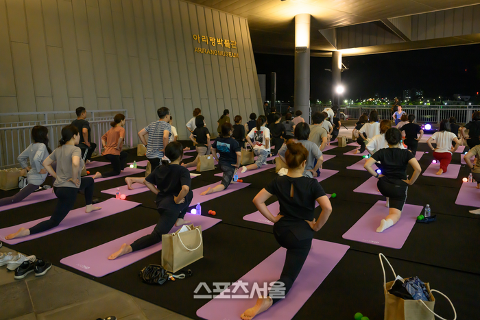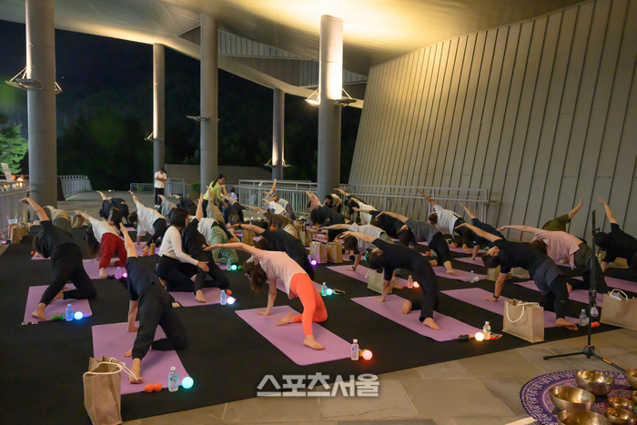 일상에서 지친 심신을 자연과 함께 치유하는 웰니스 요가에 정선군 대표캐릭터 와와군을 더한 이 행사는 지난 26일 오후 7시부터 아리랑센터 야외 데크에서 진행됐다. 프로그램 구성은 무더운 여름 지친 몸과 마음을 이완하는 볼마사지와 싱잉볼, 명상 등이었으며 이와 함께 가야금, 대금 등 전통악기 공연도 진행돼 휴식과 치유, 음악이 함께하는 프로그램 체험으로 호평을 받았다.