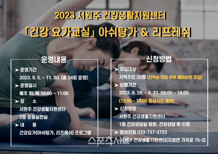 [스포츠서울ㅣ원주=김기원 기자] 서원주 건강생활지원센터는 9월부터 11월까지 매주 화, 목요일 지역 주민을 위한 ‘건강 요가교실’프로그램을 운영한다.