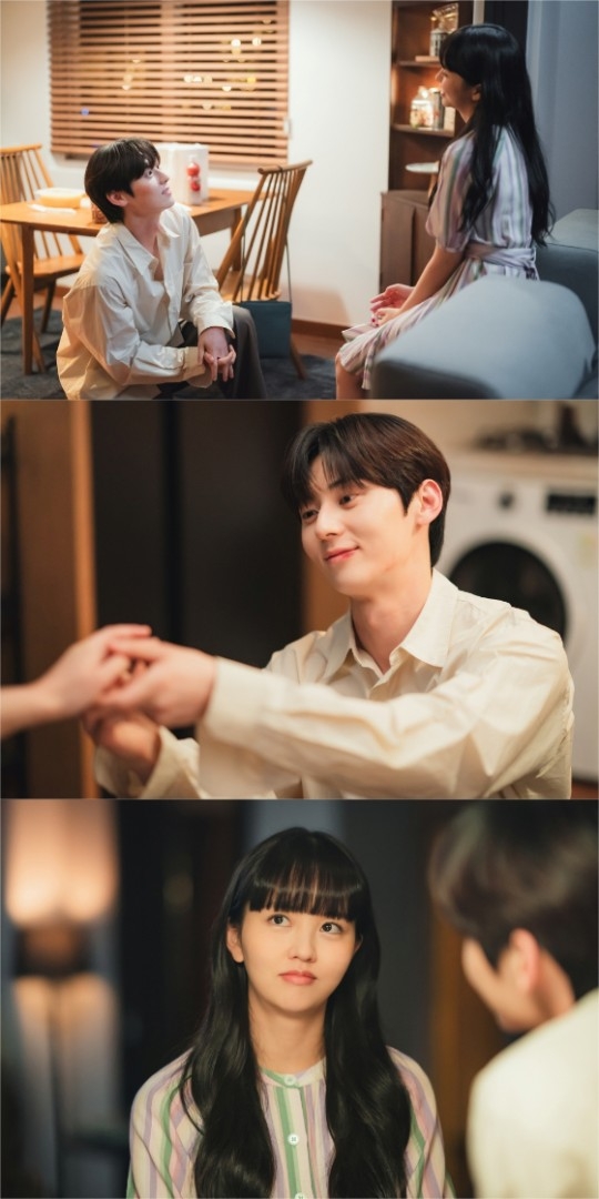 그런 가운데 공개된 사진은 또 한 번의 로맨틱한 변화를 기대케 한다. 먼저 한쪽 무릎을 꿇고 목솔희를 올려다보는 김도하의 다정한 시선이 눈길을 사로잡는다. 목솔희는 그런 김도하의 돌발 행동이 사랑스럽다는 듯 미소 짓고 있다.