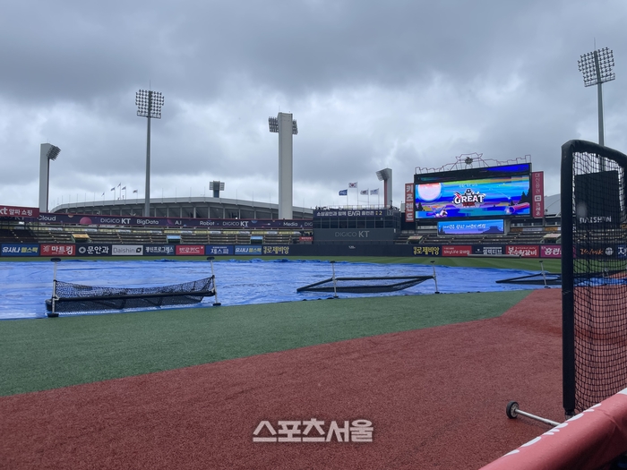 비가 문제다. 수원에 오전부터 적지 않은 비가 내렸다. 그라운드에는 일찌감치 대형 방수포가 깔린 상태.