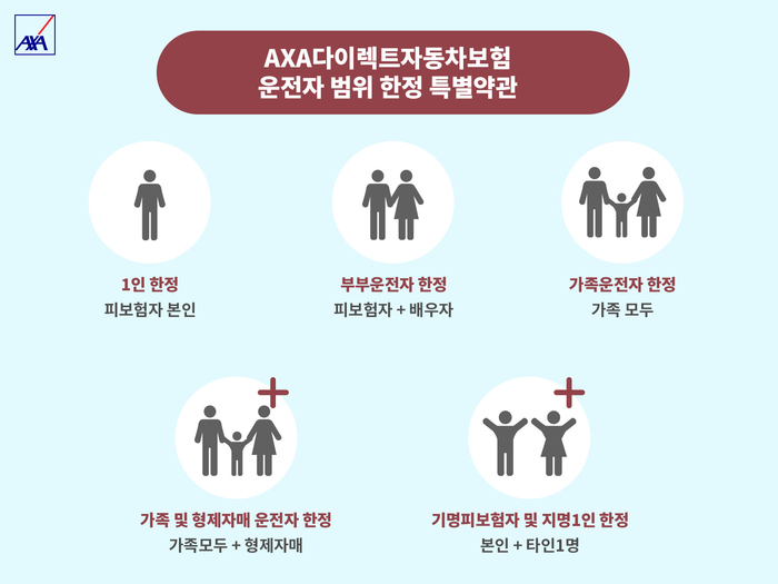 AXA손해보험에서는 ‘AXA다이렉트자동차보험’ 내 운전자 범위 한정 특약을 통해 운전하는 사람의 범위를 사전에 지정하여 보험료를 할인 받는 추가 보장을 마련했다. 여기에는 보험 가입자 본인만 운전하는 경우 외에도 ‘부부운전자 한정(본인+배우자)’, ‘가족운전자 한정(가족 모두)’, ‘가족 및 형제자매 운전자 한정(가족모두+형제자매)’, ‘기명피보험자 및 지명1인(본인+타인1명)’으로 보험 가입자가 지정한 가족 외 타인도 사고 시 보장받을 수 있다.