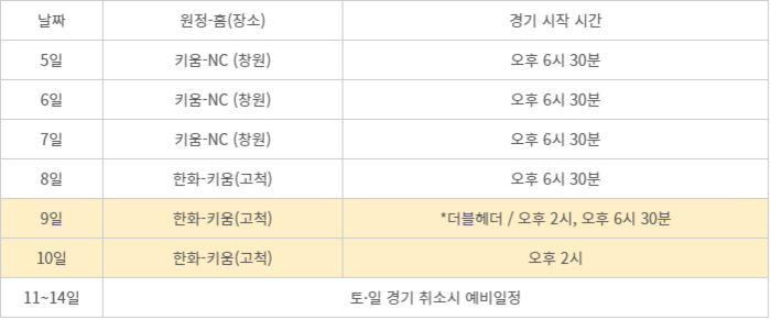 키움은 오는 9월 5~7일 창원에서 NC와 원정 3연전을 치른 후, 8일 고척에서 한화와 홈경기를 갖는다. 문제는 다음이다. 키움은 9월 9일 한화와 오후 2시부터 더블헤더를 치른다. 다음날인 10일은 더블헤더가 아니지만 주말이라 오후 2시에 경기가 있다.