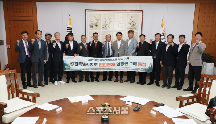 [스포츠서울ㅣ춘천=김기원 기자] 김진태 강원특별자치도지사는 8월 30일(수) 11:20, 도청 통상상담실에서 산림엑스포 조직위 김동일 부위원장을 비롯해 강원특별자치도민회, 새마을회 등 15개 민간단체* 대표들이 참석한 가운데 세계산림엑스포의 성공과 활성화(붐 업) 조성을 위해 ‘2023강원세계산림엑스포 성공기원 민간단체 입장권 구매 동참식’에 참석했다.