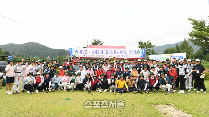 [스포츠서울ㅣ김기원 기자] 화천군 파크골프협회(회장:신준현)와 서울시 송파구 파크골프협회(회장:한병창)의 자매결연 협약식이 31일 하남면 용암리 파크골프장에서 최문순 군수, 송호관 군체육회장을 비롯해 화천군과 송파구 파크골프협회 회원 100여명이 참석한 가운데 열렸다.