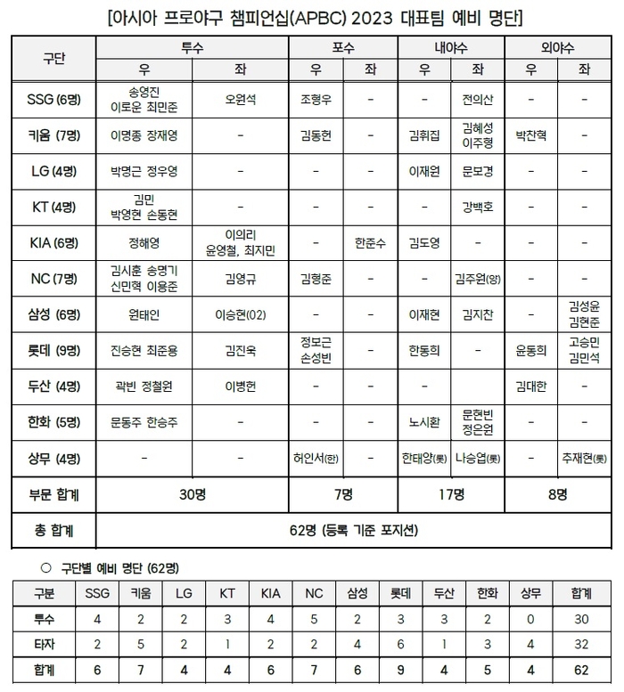 한국야구위원회(KBO)는 “29일 전력강화위원회를 열어, 오는 11월 일본 도쿄돔에서 개최되는 아시아 프로야구 챔피언십(APBC) 2023에 출전할 대표팀 예비 선수 명단 62명을 확정했다”고 밝혔다.