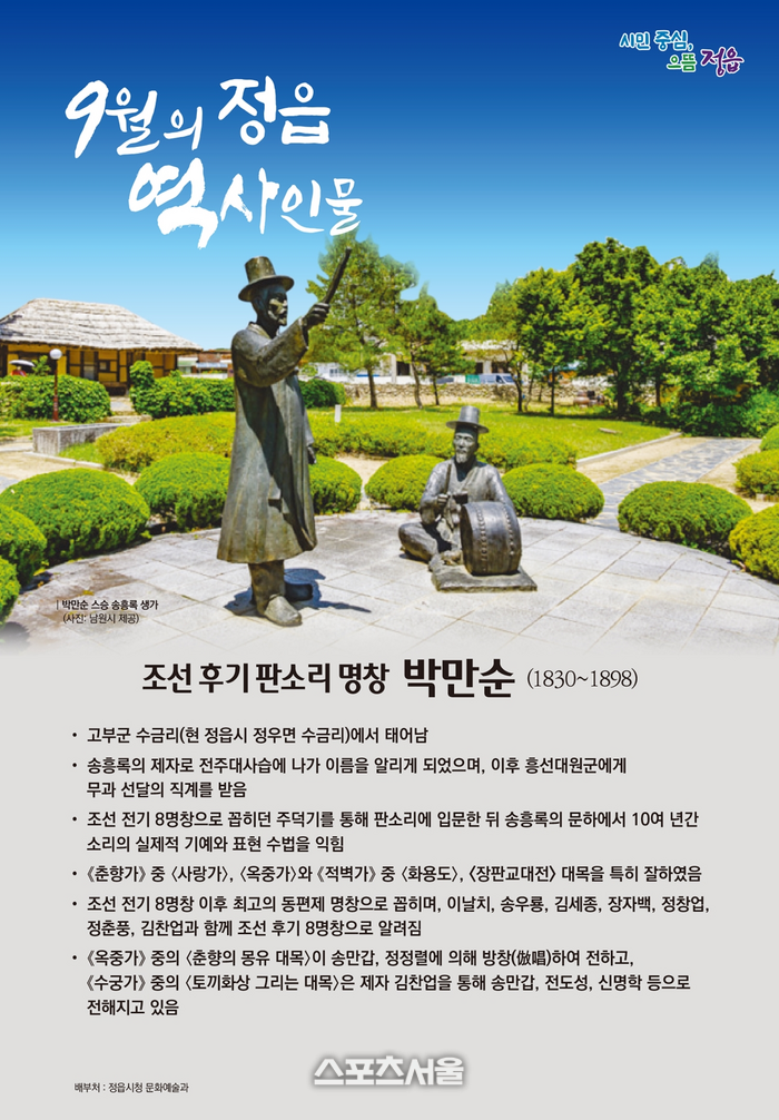 [스포츠서울ㅣ김기원 기자] 조선 후기 8대 명창에 속하는 박만순(1830~1898)명창이 이달의 정읍 역사인물로 선정됐다.